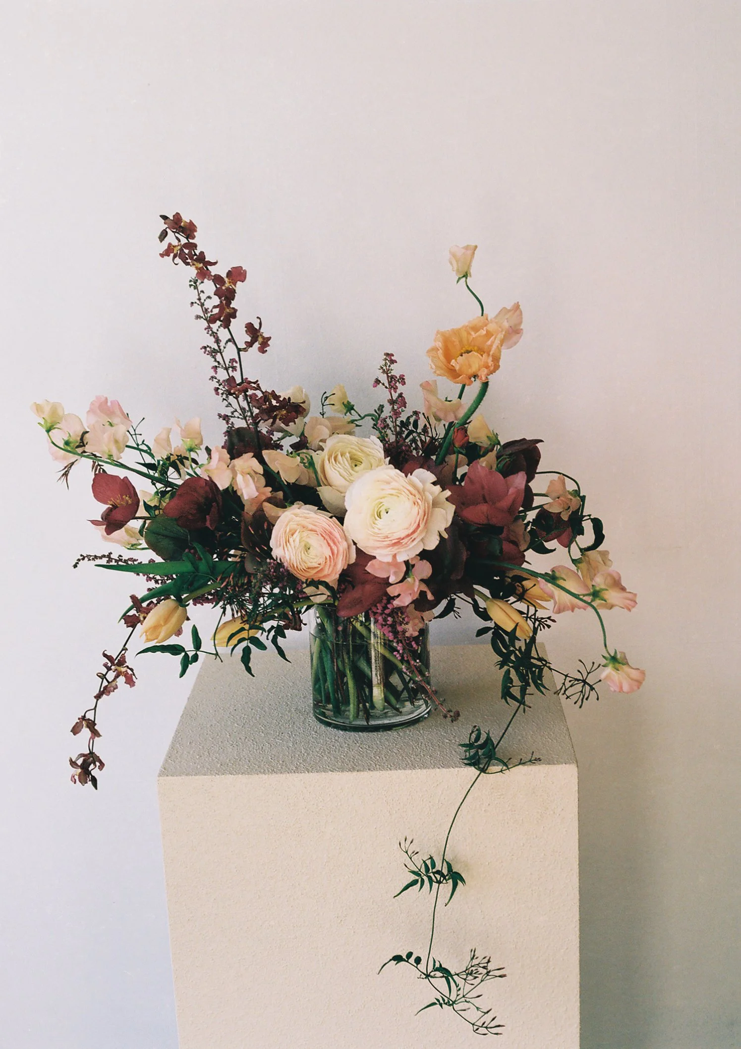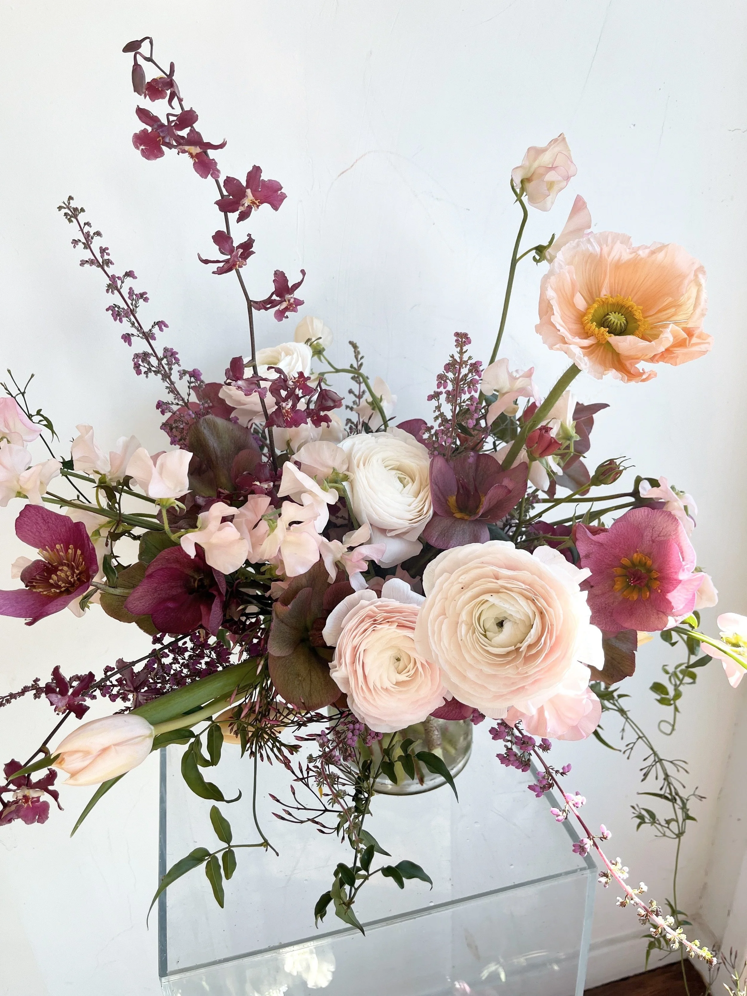 Lush: Lush arrangement full of premium blooms, perfect to use as a large centerpiece, a lush coffee table, or a bar.