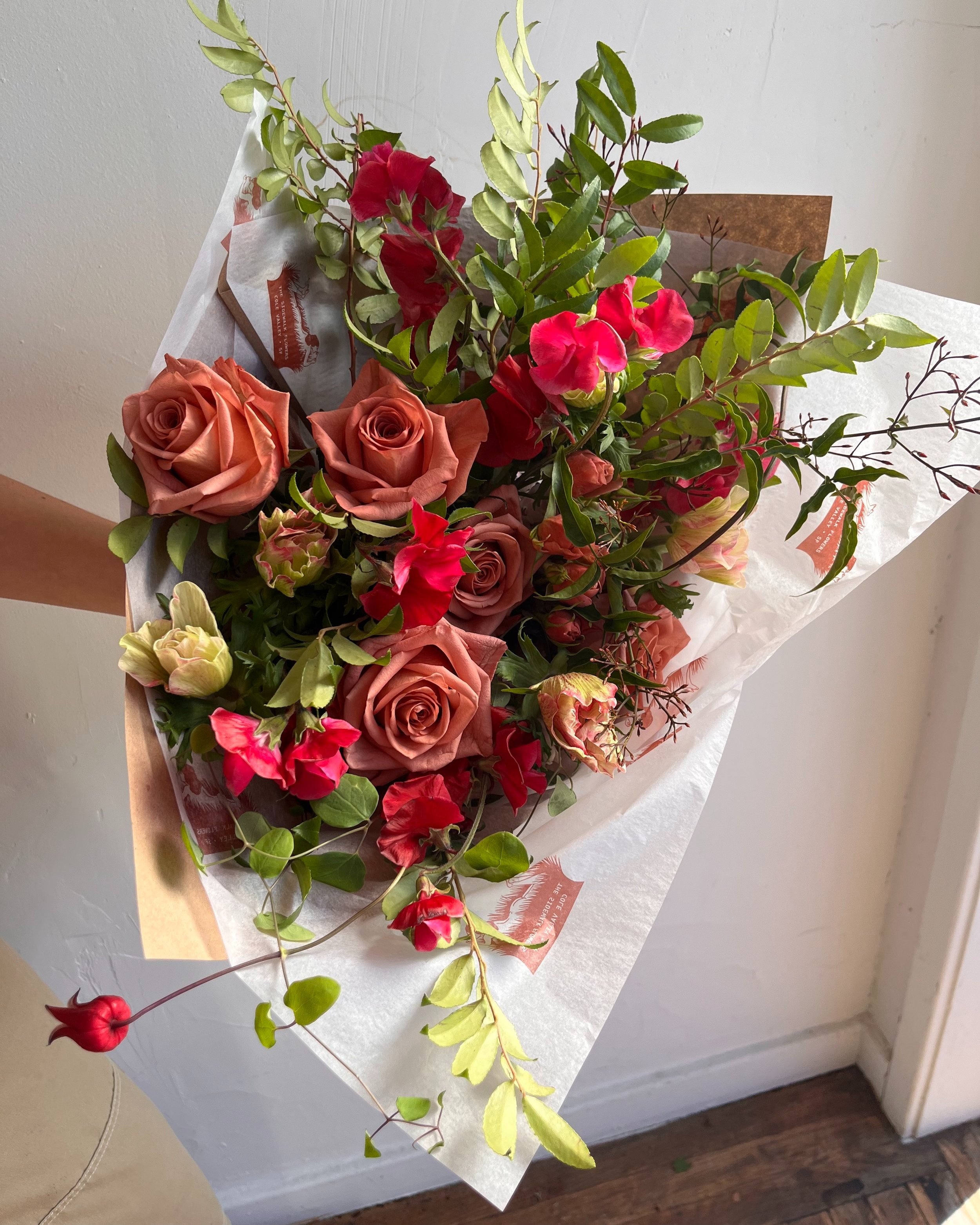 The classic red & white palette reimagines the traditional Valentine’s Day palette, adding in organic, local materials, designed with intention. This arrangement does not include a vase, and is lovingly wrapped in our custom tissue and kraft paper.